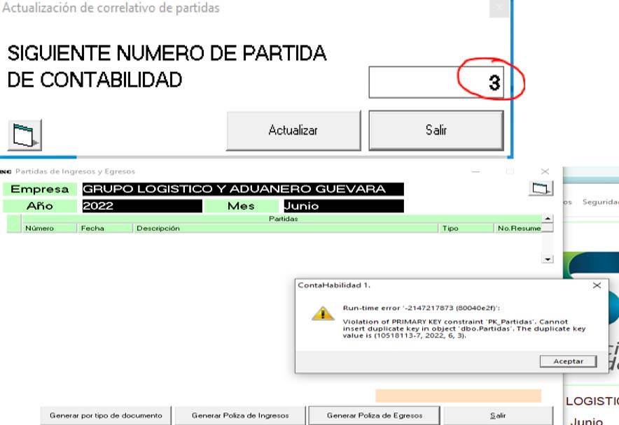 Debemos verificar en partidas que números están registradas y en correlativo de partidas actualizar el numero de partida que continua.